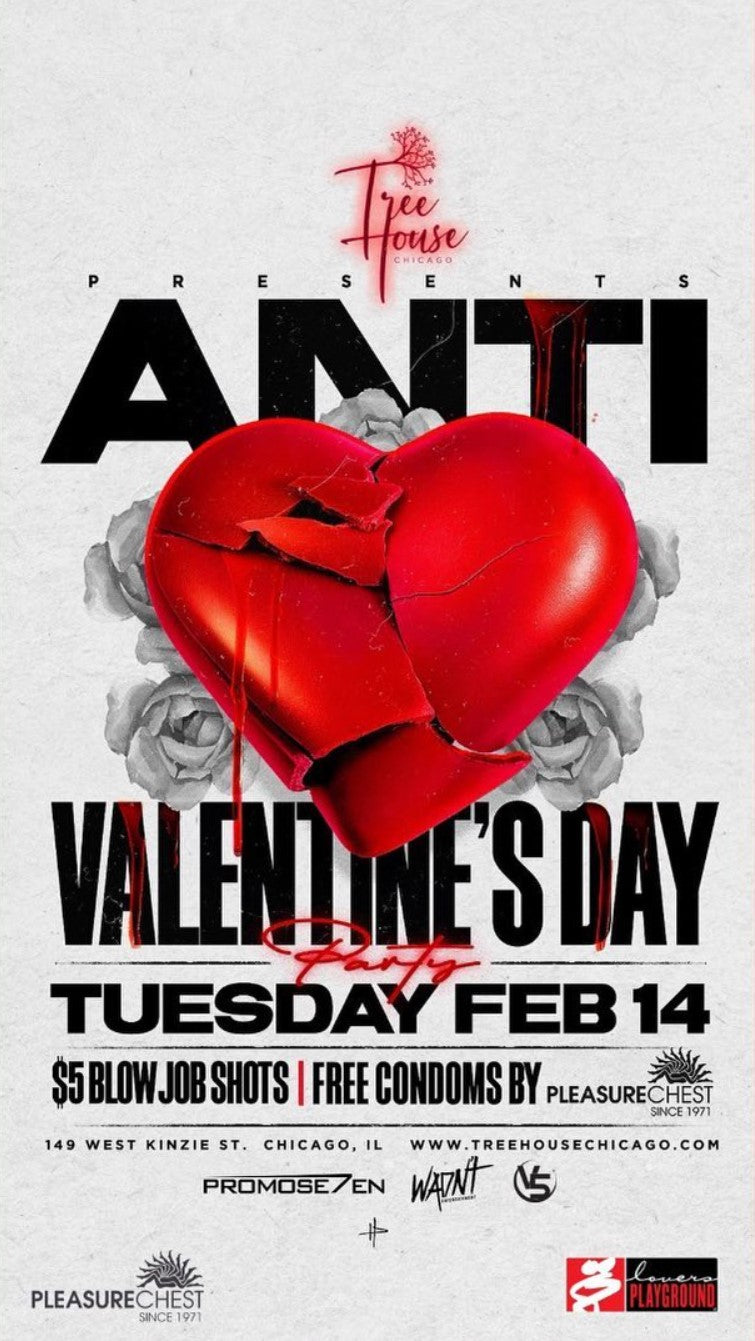 No date? No problem! Come celebrate the job of being single at our ANTI Valentines day party, w/ $5 Blowjob shots + free condoms & Prizes!