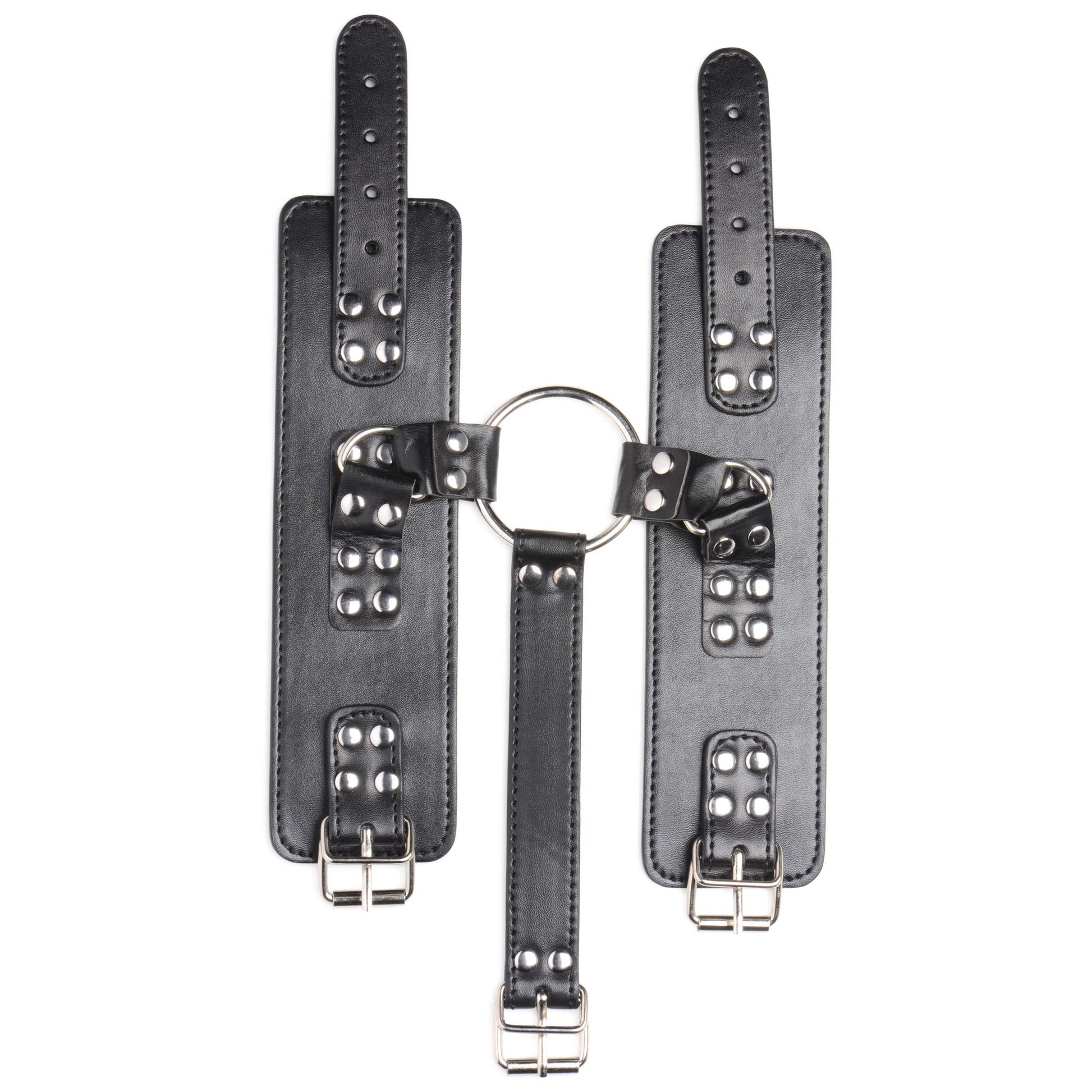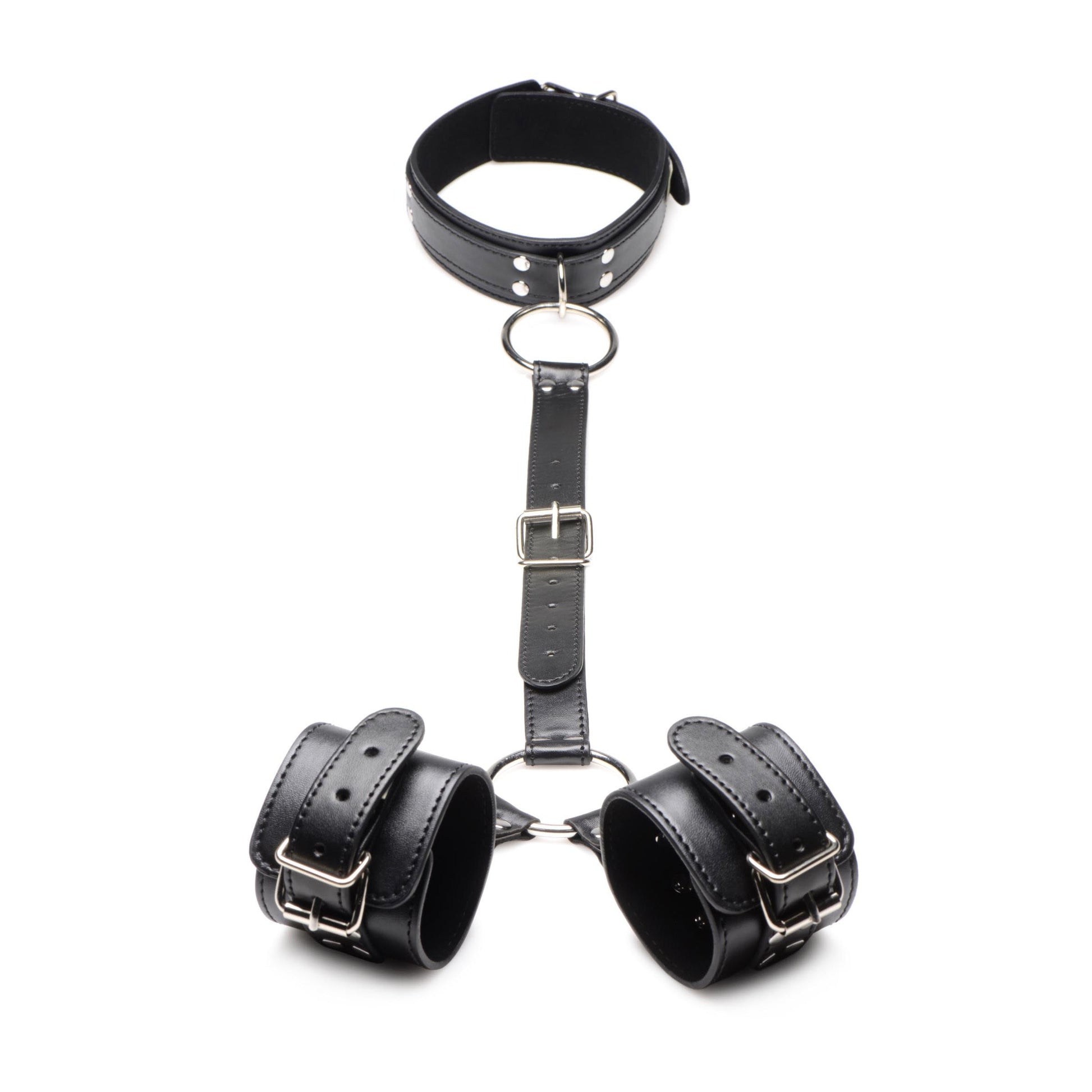 Hook your fingers around the O-rings and tug your lover towards you. Play with attaching the O-rings to different anchor points or place their hands far away from them. Their wrists will be cuffed and restrained, the center strap attached to their collared neck. Keep the center strap short to keep their hands just out of reach of their genitals so they can’t play with themselves, and enjoy teasing and toying with them. Limit their movement even more by bringing the strap around to the back and placing their restrained wrists behind their back.